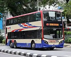 In Malaysia, Prasarana Malaysia ordered 40 Euro 3 engine Enviro500 buses for Rapid KL's Rapid Bus service. The buses serve high capacity routes around the Klang Valley, especially from Cheras and Shah Alam to the capital city of Kuala Lumpur as well as the inner routes in the city centre.[18][19] A further three Enviro500s entered service on Penang's Rapid Bus routes in August 2016,[20][21] before they were transferred to Rapid KL following unsatisfactory results. They were reintroduced to Rapid Penang in February 2022.[22]
