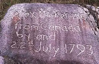 The original painting read “Alexander Mackenzie, from Canada, by land, the twenty-second of July, one thousand seven hundred and ninety-three” - ^ Sir Alexander Mackenzie's rock. End of the first journey across North America; Bishop, Richart Preston, 1884-1954
