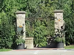 Alexander Muir Memorial Gardens feature formal flower gardens with roses,[2] herbs, and multi-tiered beds.[5] There is a decorative gate at the Yonge Street entrance bearing a plaque depicting a maple leaf to commemorate Muir and the park's 1952 reopening. Inside the park, there is a stone retaining wall that is also a monument dedicated to Muir inscribed with the refrain of The Maple Leaf Forever.[2] The Gardens contain stone balconies and steps, crushed brick pathways and sunken gardens enclosed by maple, willow and oak trees.[6]