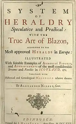 - Andrew Ross and Francis J. Grant (1892). Alexander Nisbet's Heraldic Plates. Edinburgh: Waterston. Archived from the original on 29 January 2010. Retrieved 11 January 2006.