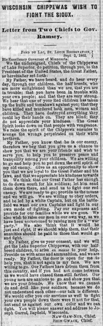 - ^ The Chippewa Embassy, The Weekly Pioneer and Democrat Vol. XIV, No.14, Sept. 19, 1862, p.5, Chronicling America, Library of Congress, 2023 [4]