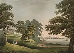 With his brother Archibald, Robertson came to the United States to teach art at the invitation of several wealthy individuals.[1] Archibald arrived in 1791,[6] and Alexander joined his brother in the autumn of 1792.[5] In the 1790s the brothers established the Columbian Academy of Painting in New York[1] on William Street.[4] It was one of the country's first art schools. Their students included John Vanderlyn, Francis Alexander, and, rare for the time, a woman miniaturist named Ann Hall.[2] Alexander taught painting and drawing.[2] The brothers taught art to amateur and professional students with a wide variety of mediums and subjects. Their methods were based upon those taught in European and British art schools at that time.[6]
