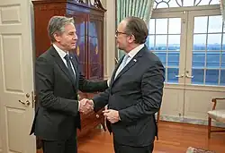 On 3 June 2019, Schallenberg succeeded Karin Kneissl as foreign minister of Austria.[24] He maintained his position as part of the second Kurz cabinet, which was sworn in on 7 January 2020. He stepped down when he became chancellor, but returned to the position following his resignation.[25]