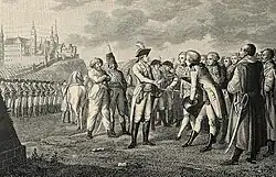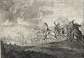 Follow-up clashes rectify Suvorov's situation: the battle of Lanckorona one day after an incident at Tyniec, where Dumouriez, the future hero of the French Republic, was severely defeated; the combat of Zamość on 22 May 1771;[43] the battle of Stołowicze; and the siege of the Wawel Castle (Kraków Castle), where the French and the szlachta, under the leadership of Brigadier Marquess Gabriel de Claude, made a sortie from the fortifications, and a force of Tyniec moved towards them – the Poles and their French allies were "defeated by brutal shooting and put to flight",[44] paving the way for the first partition of Poland between Austria, Prussia and Russia.[45] Suvorov meanwhile reached the rank of major-general.[34]