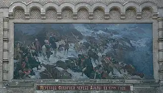 Suvorov won a decisive victory at the Battle of Rymnik, and afterwards defeated the Ottomans in the storming of Izmail. His victories at Focșani and Rymnik established him as the most brilliant general in Russia, if not in all of Europe.[3] In 1794, he put down the Polish uprising, defeating them at the battle of Praga and elsewhere. After Catherine the Great died in 1796, her successor Paul I often quarrelled with Suvorov. After a period of ill-favour, Suvorov was recalled to a field marshal position at the outbreak of the French Revolutionary Wars. He was given command of the Austro-Russian army, and after a series of victories, such as the battle of the Trebbia, he captured Milan and Turin, and nearly erased all of Napoleon's Italian conquests of 1796–97.[4][5] After an Austro-Russian army was defeated in Switzerland, Suvorov, ordered to reinforce them, was cut off by André Masséna and later surrounded in the Swiss Alps. Suvorov's successful extraction of the exhausted, ill-supplied, and heavily-outnumbered Russian army was rewarded by a promotion to generalissimo (Russian: генералиссимус, romanized: generalissimus). The most prominent battle was in the Muottental. According to one statement, Masséna himself would later confess that he would exchange all of his victories for Suvorov's passage of the Alps;[6] as per another, Masséna said that he would never forgive him for crossing won by him in Switzerland.[7] Suvorov died in 1800 of illness in Saint Petersburg. He was instrumental in expanding the Russian Empire, as his success ensured Russia's conquering of Kuban, Crimea, and New Russia.[8]