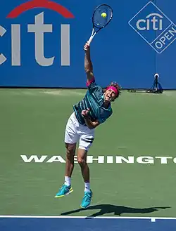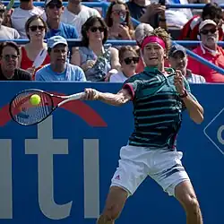 Back on hard courts, Zverev won his last two titles of the season in August. He won the Washington Open as well as a second consecutive Masters title at the Canadian Open, only dropping a single set at each tournament in each of his opening matches.[70] Notably, he needed to save three match points in his first match in Canada against Richard Gasquet, including a 49 shot rally.[71] He then defeated Roger Federer in the final to become the first player outside of the Big Four to win multiple Masters titles in the same season since David Nalbandian in 2007.[72][73] Despite this success, he was upset in the second round of the US Open by fellow Next Gen player Borna Ćorić.[74] At the end of the season, Zverev qualified for both the inaugural Next Generation Finals as one of the top seven 21-and-under players, and the ATP Finals as one of the top eight players in the world. He opted to skip the former event to focus on the latter.[75] At the ATP Finals, Zverev was grouped with Roger Federer, Marin Čilić, and Jack Sock. He defeated Čilić in his first match, but lost his final two matches and did not advance out of his round robin group.[76][77][78] Zverev finished the year ranked No. 4, peaking at No. 3 right before the ATP Finals, and accumulated five ATP titles from just six finals.[24][31]