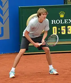 At the age of 17 years and 2 months, he became the youngest player to win a Challenger title since Bernard Tomic in 2009 and the twelfth youngest in history.[28] Zverev followed up this title with a breakthrough at the ATP Tour level. He entered the International German Open having never won an ATP match but managed to reach the semifinals. He recorded four match wins at the event, including his first career victory against Robin Haase and his first top 20 victory over No. 16 Mikhail Youzhny before losing to No. 7 David Ferrer. He became the first 17-year old to defeat a top 20 opponent since Richard Gasquet in 2004 and the first to make a semifinal since Marin Čilić in 2006.[29][30] Zverev had risen from No. 665 to No. 285 after his Challenger title, and his ATP 500 Series semifinal appearance took him to No. 161 in the world. He finished the season ranked No. 136.[31]