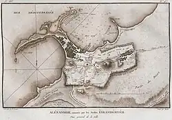 Alexandria was located on the earlier Egyptian settlement, which was called Rhacotis (Ancient Greek: Ῥακῶτις, romanized: Rhakôtis), the Hellenised form of Egyptian r-ꜥ-qd(y)t. As one of many settlements founded by Alexander the Great, the city he founded on Rhacotis was called Alexándreia hḗ kat' Aígypton (Ἀλεξάνδρεια ἡ κατ' Αἴγυπτον), which some sources translated as "Alexandria by Egypt", as the city was, at that time, in the periphery of Egypt proper (the area beside the Nile).[12] Some of the Alexandrian and Greek populaces, e.g., Hypsicles, also referred to the city as Alexándreia hḗ prós Aígypton (Ἀλεξάνδρεια ἡ πρός Αἴγυπτον, "Alexandria near Egypt").[13] In the course of Roman rule in Egypt, the city's name was Latinised as Alexandrēa ad Aegyptum.