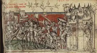 ![]() Miniature of the sack of Alexandria (1365), Reims, from manuscript of music by Guillaume de Machaut | |||||||
