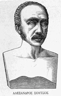 Alexandros Soutsos (Greek: Ἀλέξανδρος Σοῦτσος) (1803–1863) was a Greek poet from a prominent Phanariote family.[1] He founded the Greek Romantic school of poetry. Soutsos was born in Istanbul in 1803 from Chian parentage. At the time of the Greek Revolution, he was a young, liberal partisan. He wrote poems to encourage the insurgents. Soutsos studied in Chios, where he spent his formative years. Later he moved to Paris, where he was influenced by the liberal philosophies of the French intellectuals. His major work of prose was the novel O exóristos tou 1831 (The Exile of 1831). His works were instrumental in developing liberal thought in the young Greek monarchy. Soutsos was an admirer of Lord Byron, and he tried to emulate his grandiose style. The resultant work was his longest poem Periplanómenos (The Wanderer), which, in spite of some positive reviews, never achieved international success. In spite of his lack of artistic respect, he was admired by many of his contemporaries. The Greek people admired him for his dedication to freedom, and for his liberal ideas. He died in Athens in 1863, and his works were published in 1916.