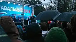 Alexei Navalny announced his intention to run for President of Russia on 13 December 2016 and since then has been traveling to cities throughout Russia to meet with supporters and open regional offices.[8] He had first spoken about doing so in April 2013, and in September of that year, he had taken part in the Moscow mayoral election, in which he got 27% of the vote.[9][10] Before that, he was one of the main leaders of the 2011 protests after the parliamentary election.[11] As noted by Newsweek and the former Russian presidential administration adviser Gleb Pavlovsky,[12] the campaign by Navalny was unprecedented in modern Russia as most candidates do not start campaigning until a few months before the election.[3] His chief of staff Leonid Volkov stated that a part of the reason they started a year early was to raise support and to give the Russian government no choice but to let Navalny take part in the election in spite of ruling regarding the Kirovles case.[13] The primary focus of Navalny's campaign is combating the corruption within the current government under Vladimir Putin and Prime Minister Dmitry Medvedev.[3] In mid-April 2017, Navalny was endorsed by the exiled oligarch Mikhail Khodorkovsky[14] and the liberal People's Freedom Party leader Mikhail Kasyanov as an alternative to incumbent President Vladimir Putin.