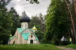 According to Dmitry Chmelnizki, the best example of this style is the Saint Basil Monastery in Ovruch, designed in 1907–1909 and completed in 1910: "the strictly functional floorplan, nearly absolute absence of direct borrowings, and the freedom in the treatment of form foreshadow Shchusev's constructivist buildings... thoroughly modern, in spite of clear allusions to Old Russian architecture".[28] According to biographer Kirill Afanasyev, the most visually striking is the small church on the Natalievka estate, conceived as a private museum of Russian icons.[36] The best known of Shchusev's churches, and arguably one of the best works of Russian Art Nouveau is the cathedral of the Marfo-Mariinsky Convent in Moscow, which Shchusev designed in collaboration with Nesterov in 1908 and completed in 1912.[37][38] Prior to the outbreak of World War I, Shchusev also designed and built churches in Bari and Sanremo, in Italy; in Cuhureshti in Moldova; and on the Kulikovo Field in Southern Russia.[39][40] The last building to be completed before 1918 was the church of the Brotherhood Cemetery, which was built during the war to administer last rites to the dying soldiers and was demolished in the 1940s.[41][29]