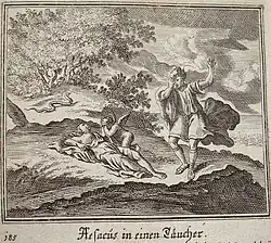 The Bibliotheca makes Aesacus son of Priam's first wife Arisbe, daughter of Merops.[1] Apollodorus and Tzetzes also make Aesacus a seer who has learned the interpretation of dreams from his grandfather Merops.[2] For them Aesacus is the interpreter of Hecabe's dream when Hecabe gives birth to Paris. In Apollodorus the deceased daughter of Cebren for whom Aesacus mourns is his wife named Asterope.