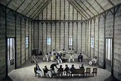 For several months, Bachelot and his fellow missionaries lived in three small rented structures,[9] saying their first mass on the island in a grass hut.[11] They later built a chapel on a small plot of land they purchased,[9] where the Cathedral of Our Lady of Peace[12] was dedicated in 1843.[13] After settling on the island, the group avoided drawing attention to themselves and studied the Hawaiian language.[12] During their mission's first two years, the group converted 65 Hawaiians[12] and ministered to Hawaiians who had already been converted.[14] They often held surreptitious night-time meetings with converts who feared persecution.[11] The priests' vestments and rituals made their evangelism efforts more effective because they reminded Hawaiians of native religious customs.[14]
