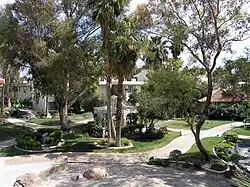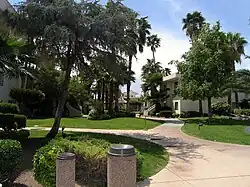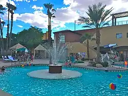 Alexis Park opened on July 2, 1984,[5] with 500 rooms, all of them suites and located in a series of white-colored motel buildings. Most of the buildings were two stories, although some featured lofts.[3][8] The 19-acre Alexis Park featured a Mediterranean theme with a country club setting, including greenery and palm trees, waterfalls and streams, and fake boulders. The hotel included a nine-hole putting green and two restaurants. Other amenities included three pools, a fitness center, a spa, tennis courts, and office facilities.[1][2][9][3] Schulman considered the resort a retreat for business executives.[10] Alexis Park was built just east of the Las Vegas Strip,[1][6] and the resort offered free bus shuttle service to the Strip.[9] The McCarran International Airport was also located nearby.[1]
