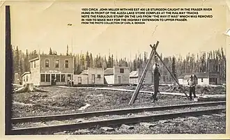 Reduced demand in the auto industry dramatically shortened the 1930 sawmill season.[429] The next year, fire totally destroyed the mill. The Forestry Service's firefighting equipment could only save the dressing plant.[430] After a period of uncertainty, and a dissolution of the partnership, Samuel Bailey Trick (c.1871–1941) announced plans to rebuild.[431] In the mid-1930s, the four major sawmills were Giscome Mills, Sinclair Mills, Thrasher Lumber at Snowshoe, and S.B. Trick Lumber of Aleza Lake.[432] When owner, S.B. Trick, died of pneumonia, his son, Ambrose J.E. Trick (1905–92),[433] and son-in-law, Harry Morison (1902–59),[434][435] president and secretary respectively, became partners in the venture.[119][436] Their families joined them for the summer months.[437][438]