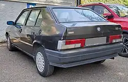 In autumn 1986 a mild facelift resulted in a revised range.[20] Exterior alterations were limited to clear instead of amber-coloured indicator lenses, new wheel covers and alloy wheels, the adoption of side skirts by all models, and a redesigned front grille; two-tone paint schemes were discontinued. If outside there were only detail changes, the interior was more deeply revised; starting from a more conventionally designed dashboard and steering wheel, which superseded the innovative moveable instrument binnacle.[20] All 1.5 variants now had the 105 PS engine from the now discontinued 1.5 QV; a TI (Turismo Internazionale, International Touring) trim level was exclusive to the front-wheel drive 1.5 hatchback. Changes were made to the suspension, brakes and gearbox, with closer-spaced ratios.[21]