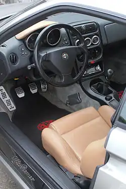 The GTV Cup is a limited edition inspired by the mono-make Alfa GTV Cup race series in Italy. Only 419 cars were built in total,[20][21] with 264 LHD versions and 155 RHD versions. Two different engines were used in the production: 180 cars were built with the 3.0 V6 24V (all 155 RHD versions were 3.0 models) and 239 cars with 2.0 Twin Sparks.[22] The 3.0 V6 cars were only painted in Alfa Romeo Red while 2.0 TS cars were almost exclusively painted in Grigio Chiaro (there are just a few examples in red).[23] Limited edition plaques, that were made of silver, differed for the RHD and LHD versions, having red and black texts accordingly and each run was separately numbered (i.e. there is both a LHD 001 and a RHD 001). Differences between the standard GTV and the Cup version are factory fitted rear spoiler, front spoiler, side skirts, wheel arch side vents and titanium-like finish 17-inch 'telephone dial' alloys;,[24] although mechanically they are the same as the regular specifications. The Cup exclusive interior offers half-leather upholstery and the plastic centre console fascias were finished in a darker shade of grey. 2.0 TS GTV Cups have 4-pot Brembo callipers as have 3.0 V6 GTVs.