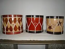 Alfaias are usually between 40 centimetres (16 in) and 55 centimetres (22 in) in diameter. Their construction is similar to 19th-century American and European military or field drums, and Latin American wooden bass drums. Their drumheads are clamped to the body through large wooden hoops, and they are played with distinctly-shaped thick wooden drum sticks. Sometimes the stick used in the dominant hand is marginally larger than the one used in the weak hand.