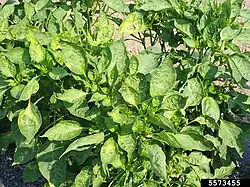 Alfalfa mosaic virus (AMV), also known as Lucerne mosaic virus or Potato calico virus, is a worldwide distributed phytopathogen that can lead to necrosis and yellow mosaics on a large variety of plant species, including commercially important crops. It is the only species in the Alfamovirus genus of the family Bromoviridae. In 1931 Weimer J.L. was the first to report AMV in alfalfa (Medicago sativa). Transmission of the virus occurs mainly by some aphids (plant lice), by seeds or by pollen to the seed.[1][2]