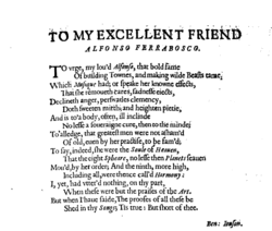 Ferrabosco collaborated with Ben Jonson on several projects, including The Masque of Blackness (1605), and wrote music for several other masques besides. His music was published by John Browne in 1609, including a number of settings of poems by John Donne and Thomas Campion, as well as lute and viol music. He frequently wrote in the new declamatory Baroque style, and although he never went to Italy, he was well aware of contemporary Italian music.[3]
