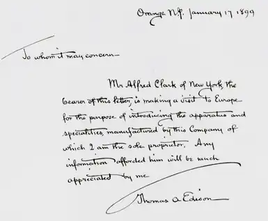 Alfred Clark (December 19, 1873 – June 16, 1950) was a pioneer of music recording and cinema. As a cameraman and director of productions at Edison's first studio, he was the first to make moving pictures with innovations like continuity, plot, trained actors and special effects.[1] In 1896, he joined Emile Berliner's Gramophone Company and then went to Europe where he became an important manager of companies like His Master's Voice and EMI. He was naturalized as a British citizen in 1928 and became a leading member of the Oriental Ceramic Society in London, establishing a valuable collection including rare pieces which had been made for the emperors of the Tang and Song dynasty.[2]