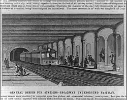 Beach's most famous invention was New York City's first subway, the Beach Pneumatic Transit.[18] He received his first charter by the legislature in 1868, four years before Commodore Vanderbilt's attempt to build a subway in New York.[19][20] Beach created his own enterprise using pneumatic tube technology, naming it the Beach Pneumatic Transit Company, and made himself its President. This idea came about during the late 1860s, when traffic in New York was very difficult, especially along its central artery of Broadway, crowded with pedestrians and horse carriages. Beach was one of a few visionaries who proposed building an underground railway under Broadway to help relieve the traffic congestion. The inspiration was the underground Metropolitan Railway in London, but in contrast to that and others' proposals for New York, Beach proposed the use of trains propelled by pneumatics instead of conventional steam engines, and construction using a tunnelling shield of his invention[21] to minimize disturbing the street.[22]