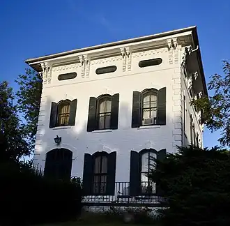 The two-story brick structure is a textbook example of the Italianate style.[2] The house features rusticated stone quoins, paired elongated bracketed eaves, stilted segmented arched windows, and a square-cut bay on the south side. It originally had a full-width front porch, which has subsequently been removed. The house was listed on the National Register of Historic Places in 1984.[1]
