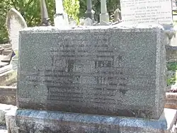 However, it was not a happy time for the newly arrived Raymond family. Shortly after their arrival in Brisbane, their baby son Leslie died on 4 April 1884 and then exactly two years later (4 April 1886) Bessie died.[8] Bessie and Leslie are buried together in Toowong Cemetery.[9] Devastated by Bessie's death, Alfred is said to have returned to England with his surviving son Alfred (known as Fred), only to decide on returning that the climate was better in Brisbane and so he came back to Brisbane. However, there is no proof that these journeys took place, but equally there are no records of Alfred in Brisbane in years immediately after Bessie's death.