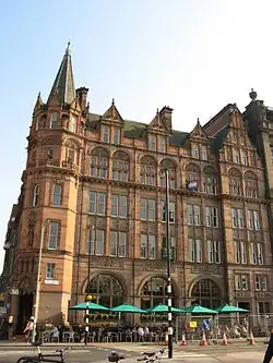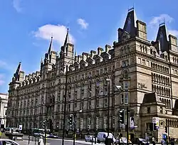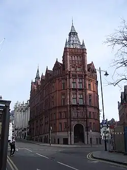 During his period in Manchester Waterhouse's most important commissions were for the Assize Courts and Strangeways prison. The competition to design the new Manchester Assize Courts was launched in 1859. It received 107 entries, by many leading architects including: Edward Middleton Barry; Cuthbert Brodrick; a joint entry by Richard Norman Shaw and William Eden Nesfield; Edward Buckton Lamb; Thomas Worthington; and the runner up Thomas Allom.[20] His success as a designer of public buildings was assured when he won the competition. The building, constructed 1859–65 (now demolished) not only showed his ability to plan a complicated building on a large scale, but also marked him out as a champion of the Gothic cause.[21] The building cost £120,000 (approx £14,500,000 in 2019) to build.[22] The Gothic style of the building was influenced by John Ruskin and his views on Venetian Gothic architecture. Designer John Gregory Crace carried out the elaborate decoration in the Grand Jury Room and the elaborate carving in the central hall was by O'Shea and Whelan. The exterior also had elaborate decoration in contrasting coloured stonework with sculpture and carvings. The foundations were dug by H. Southern & Co.; the building's superstructure was erected by Samuel Bramall; heating and ventilation was the responsibility of G.N. Haden as well as O'Shea and Whelan. Stone carving was also done by Thomas Woolner and Farmer & Brindley; ceramic tiles were provided by Thomas Oakenden; stained glass was by R.B Edmundson, Lavers & Barraud, George Shaw and Heaton, Butler & Bayne; furniture and furnishings were provided by Doveston, Bird & Hull, James Lamb, Kendal & Co., J. Beaumont, Minton & Co. and Marsh & Jones Co.; iron work was by F.A. Skidmore & R. Jones; chimneypieces were by J. Bonehill, W. Wilson and H. Patterson; plaster ceiling roses were by J.W. Hindshaw. The clerk of works were John Shaw, G.O. Roberts and Henry Littler.[23] This building was Waterhouse's first exercise in High Victorian Gothic.