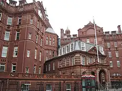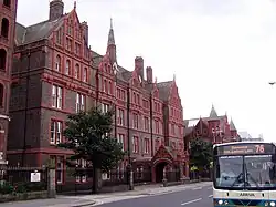 He used terracotta in buildings of all styles from the Romanesque of the Natural History Museum, the Early English Gothic at Girton College, or the Perpendicular Gothic at St Paul's School Hammersmith, even neoclassical at the Parrot House Eaton Hall.[64] When Burmantofts Pottery developed their process to produce faience in 1879 Waterhouse started using it for his interiors. Most notably at The Victoria Building, University of Liverpool; the Chapel, Royal Liverpool Infirmary; Yorkshire College; the National Liberal Club and the final phase of Holborn Bars. He especially liked to clad columns in faience, but walls and fireplaces as well. He also made much use of glazed tiles and terracotta within buildings, for example in the corridors at Manchester Town Hall.[65]