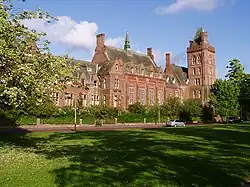 His father was Alfred Waterhouse Senior (1798–1873), a cotton broker, and his mother was Mary Waterhouse, née Bevan (1805–1880), of Tottenham, both Quakers. Alfred, first of their eight children, was born on 19 July 1830 when the family was living at Stone Hill, Liverpool. Shortly after his birth, the family moved to Oakfield, a Tudor-style villa in Aigburth, Liverpool, Lancashire.[1] His brothers were accountant Edwin Waterhouse (1841–1917), co-founder of the Price Waterhouse partnership, which now forms part of PriceWaterhouseCoopers, and solicitor Theodore Waterhouse (1838–1891), who founded the law firm Waterhouse & Co, now part of Field Fisher Waterhouse LLP in the City of London.[2][3] Alfred Waterhouse was educated at the Quaker Grove House School in Tottenham, later to become Leighton Park School.[4]