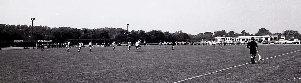 The ground has a covered stand which occupies half of one side of the western end of the ground with seating for 85.[1] The stand also has room for around 250, plus a few benches.[1] The ground has a concrete path around the entire pitch. The Clubhouse is on the northern end of the ground.[1] Floodlights were added in 1996.[2] The ground was refurbished in 2010.[3]