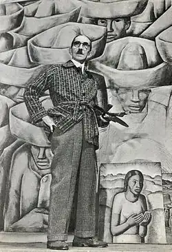 Alfredo Ramos Martínez in Los Angeles, 1941. In the background, a drawing for the unexecuted mural, Los Charros del Pueblo.