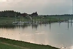 Immediately to the south, where the artificially constructed conduit of the river Hase flows into the Alfsee lakes, there is a small auxiliary basin (Absetzbecken) in front of the actual reservoir, from which water flows into the lake via a roughly 330 m long overflow dam.