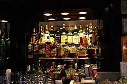 The hotel's Blue Bar has operated since 1933, following the end of Prohibition in the United States.[66][67] Originally, the Blue Bar was placed in a niche behind the reception counter.[27] The niche was closed and converted to storage space by the 1980s.[27][68] The Blue Bar relocated to the annex in 1997,[27][35] with its own entrance from the street.[69] The New York Times wrote in 2000: "The Blue Bar is frequented by widows and well-traveled gentlemen with a predilection for theater."[70] In 2012, the Blue Bar was renovated and expanded into part of the space formerly occupied by the Oak Room.[16][27] The expanded Blue Bar contained blue lighting and blue-toned backlit bookshelves, with black-and-white floors that resembled those in the main reception area.[16][27] The Blue Bar was relocated to the main lobby in 2022. The modern bar contains design elements similar to those added in the 2012 renovation, but the rear of the bar can be cordoned off for private parties.[34][39]
