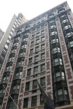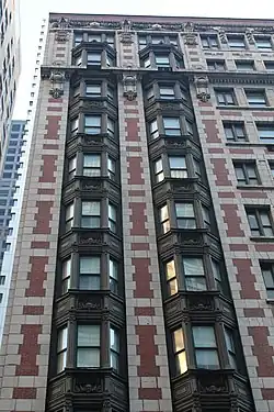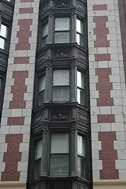 The third through eleventh stories are seven bays wide and are made of brick with limestone quoins. The four outermost bays on each story contain projecting bay windows with angular window frames, each consisting of a wide glass pane flanked by angled narrow sidelights.[14] The angled windows were intended to increase each unit's exposure to natural light.[6] There are panels, urns, and floral motifs in the angled sidelights; some of the panels have been replaced with air conditioning grilles.[14] The band course above the tenth story protrudes from the facade; the underside of the band course contains dentils and scrolled console brackets. On the eleventh and twelfth stories, there are panels with roundels between each of the three middle windows; a similar panel is placed above the twelfth-story windows. At the twelfth story, the four outermost windows are flat rather than angled, as on the second story.[15]