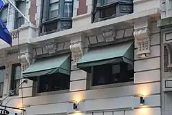 The western annex was originally a two-story stable but was expanded to a three-story brick structure in 1905.[15][9] The first story contains a wooden storefront with metal decorations. There is a double door at the center of the storefront, with a canopy in front of the door.[15] This entrance leads to the Blue Bar.[16] The entrance is flanked by display windows, which in turn are topped by transom panels with metal grilles. On either side of the storefront are pilasters decorated with Native Americans' heads.[15] The second story contains a projecting window with multiple panes, as well as angled sidelights. The third story is divided into three sections, above which is a cornice supported by brackets and decorated with lions.[15]