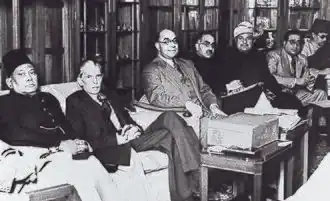 ![]() Members of the government, with Liaquat Ali Khan himself sat at the center, and Governor-General Jinnah to his left. | |