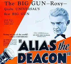 Alias the Deacon is a 1927 American silent drama film directed by Edward Sloman and starring Jean Hersholt, June Marlowe, and Ralph Graves. It was produced and released by Universal Pictures. Based on a stage play of the same name, it was directed by Edward Sloman and is preserved at the Library of Congress Packard Campus for Audio-Visual Conservation.[1][2] It was remade as the sound film Alias the Deacon in 1940.