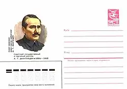 ![]() A Soviet commemorative stamped envelope featuring a portrait of Jangeldin  | |