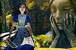 Rumors of a sequel to Alice first developed shortly after the original game was released to critical and commercial success, though at that time, the development team behind the original were working on the ultimately-canceled spin-off, American McGee's Oz. As the development of the movie adaptation of American McGee's Alice took longer and the original game became more of a cult classic, in 2007 interest at Electronic Arts rose in a remake of the game and work was started on a sequel.[7] However, when the movie adaptation fell through, plans for a sequel were shelved, and remained so for nearly a decade. At the February 2009 D.I.C.E. Summit, EA announced a sequel, which at the time had the working title The Return of American McGee's Alice.[8][9] Two pieces of concept art accompanied the announcement, along with the information that the original game's writer and executive producer would also return for the sequel.[10] In November of that year, a fan-made trailer (with the title "The Return of Alice") was mistaken by gaming news outlets as an official teaser for the game, in which Alice is in therapy after a relapse nine months following the events of the first game, and appears to hallucinate an image of the Cheshire Cat in place of her doctor.[11]