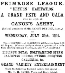 In the 1880s and 1890s Dryden was also active in the Primrose League,[2] an organisation supporting Conservative principles, which held summer fairs in the grounds of big houses like Canons Ashby.