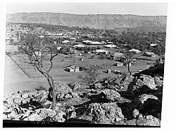 It was not until alluvial gold was discovered at Arltunga, 100 kilometres (62 mi) east of the present Alice Springs, in 1887 that any significant European settlement occurred.[23] The town's first substantial building was the Stuart Town Gaol in Parson's Street; this was built in 1909, when the town had a European population of fewer than 20 people. Many of the jail's first prisoners were first-contact Aboriginal men imprisoned for killing cattle.[24] The first aircraft, piloted by Francis Stewart Briggs, landed in 1921.[25] Central Australia's first hospital, Adelaide House, was built in 1926 when the European population of the town was about 40. It was not until 1929, when the train line to Alice was built, that the town's European population began to grow. Aboriginal Centralians outnumbered European Centralians until the mid-1930s.[26] From 1926 to 1931, Alice Springs was the seat of government for the now-defunct Territory of Central Australia.[27][28] Until 31 August 1933, the town was officially known as Stuart.[29]