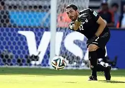On 1 June 2014, he was included in Iran's 2014 FIFA World Cup squad by Carlos Queiroz.[39] On 16 June 2014, Haghighi started in Iran's opening match in the World Cup against Nigeria. Haghighi became the first Iranian goalkeeper to achieve a clean sheet at a FIFA World Cup with a goalless draw. He also started Iran's next two matches in the World Cup against Argentina and Bosnia and Herzegovina. He showed a good performance in the Argentina match, where he saved shots from Lionel Messi, Gonzalo Higuaín and Sergio Agüero. He conceded the match's only goal in the 91st minute when Lionel Messi dribbled inside and curled a left-footed shot past the outstretched hands of Haghighi. In Iran's next and final tournament match, Haghighi conceded goals from Bosnia and Herzegovina strikers, where Iran was eliminated from the 2014 FIFA World Cup in the group stages after a 3–1 defeat.