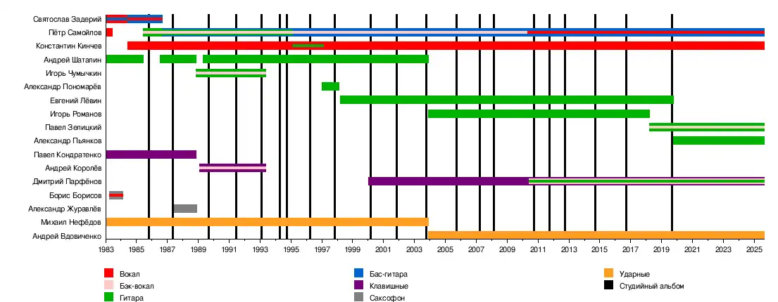 - Petr Samoylov - bass, backing vocals (1986–present), vocals (1983), guitar, backing vocals (1985—1986)