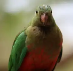 Size: 43 cm (17 in) long. Male is mainly red and green and the female is mainly green. A band of pale green feathers on each wing is prominent in the male and small or absent in the female. Blue back and rump. Yellow irises. Grey legs. Its two subspecies are similar except in size, the northern subspecies being the smaller.[1] Habitat: Diet: |