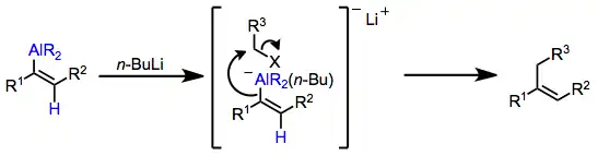 Alkenyl- and alkynylaluminates are most commonly generated through the addition of n-butyllithium to the alkenylalane. The alkenyl and alkynyl groups, which are better able to stabilize negative charge, are transferred in preference to the alkyl group. When these intermediates react with alkyl halides, functionalized olefins are produced.[15]