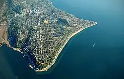 Alki Beach Park is a 135.9-acre (55.0 ha) park located in the West Seattle neighborhood of Seattle, Washington that consists of the Elliott Bay beach between Alki Point and Duwamish Head.[2] It has a 0.5 miles (0.80 km) of beachfront, and was the first public salt-water bathing beach on the west coast of the United States. It is open daily from 4am to 11:30pm.[3]