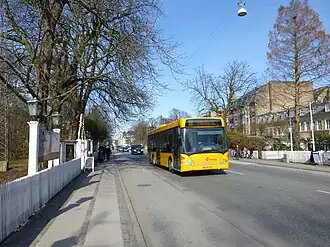 Allégade (lit. "Avenue Street") is the oldest street in the Frederiksberg district of Copenhagen, Denmark. It runs from Frederiksberg Runddel to Frederiksberg Town Hall Square, along the east side of Frederiksberg Gardens, connecting Pile Allé to Falkoner Allé. The streetscape is, in spite of the central location, characterized by houses that are pulled back from the street with front gardens behind white fences. Several buildings are old country houses from the time when Frederiksberg was a summer destination outside Copenhagen. Along the northernmost part of the street, on its west side, is a narrow garden complex, Digterlunden (literally "Poet's Grove") with a statue of Holger Drachmann.